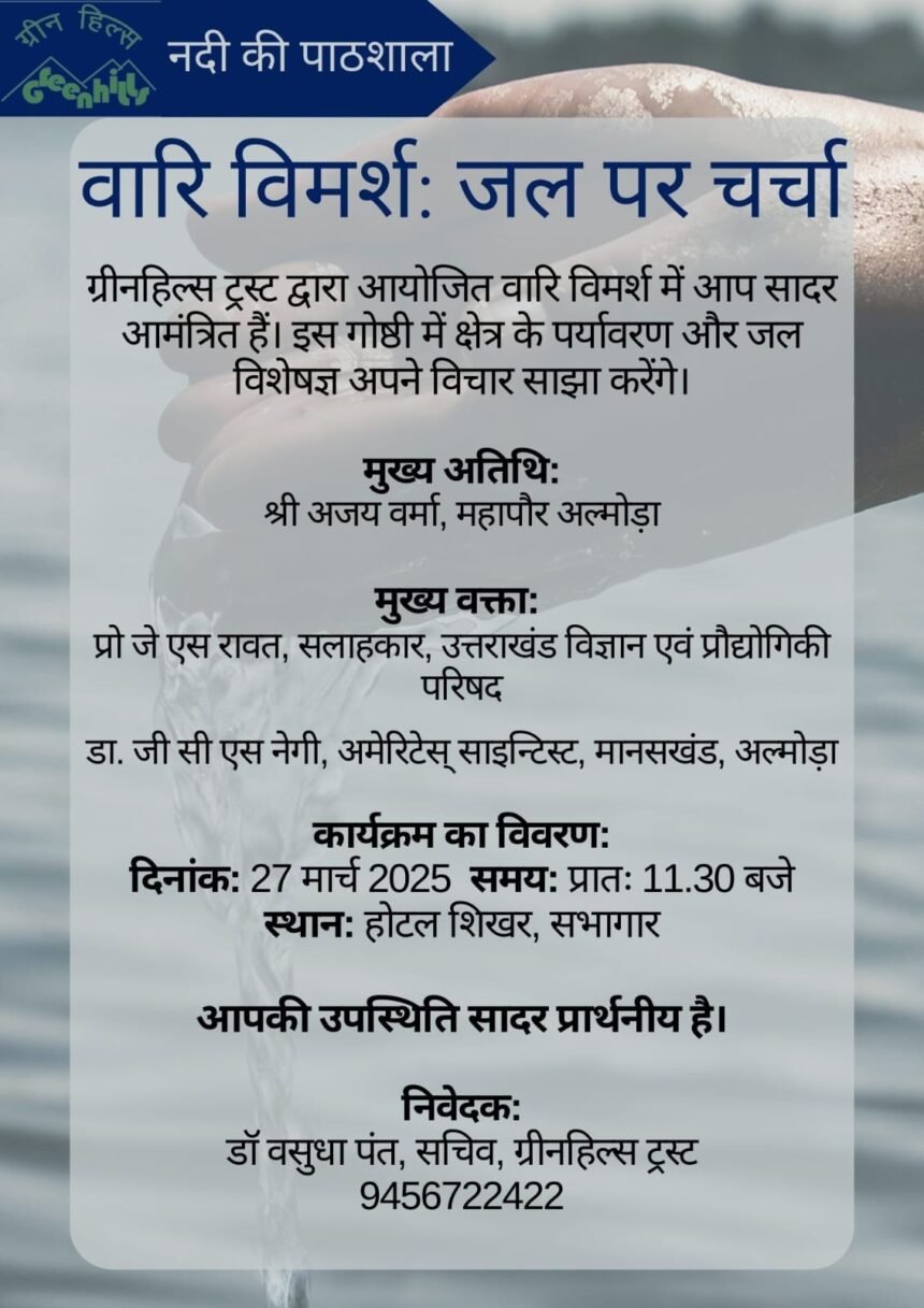 Khabar UK 27x7 > Blog > उत्तराखंड > अल्मोड़ा > ग्रीन हिल्स ट्रस्ट एवं गंगा सुरक्षा समिति द्वारा गोष्ठी “वारि विमर्श: जल पर चर्चा” का गुरुवार को होगा आयोजन